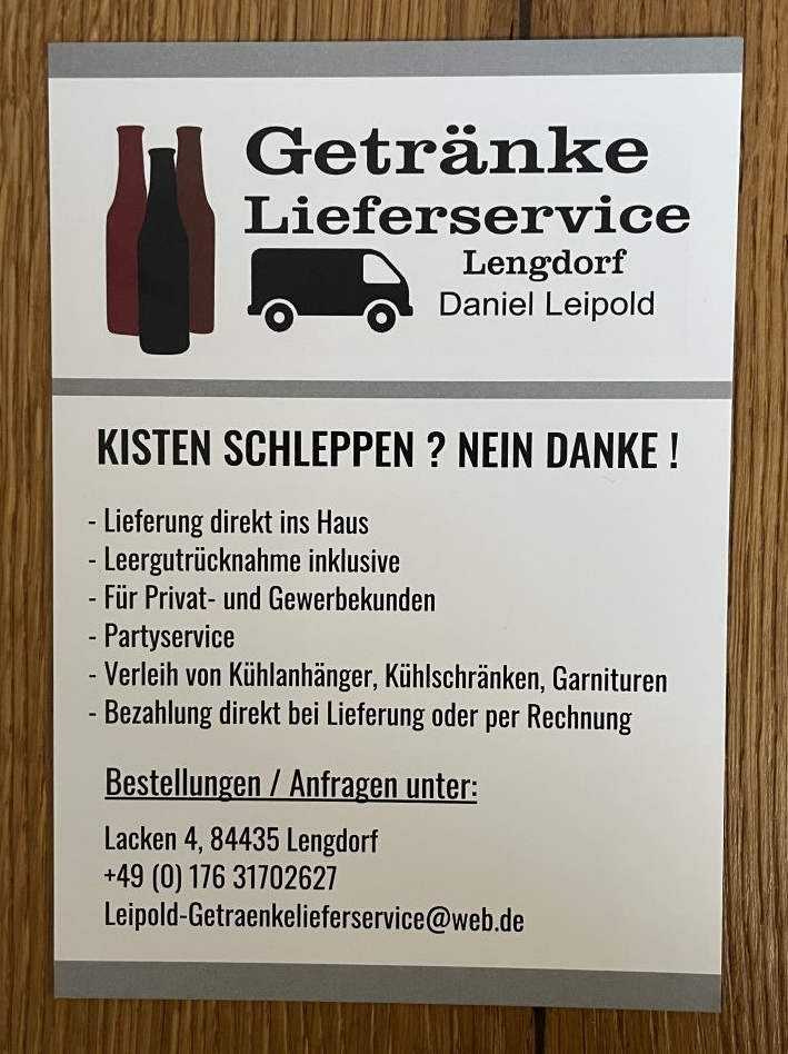 Herzlich Willkommen KISTEN SCHLEPPEN ? NEIN DANKE ! Sie haben das mühsame Schleppen von schweren Getränkekästen satt? Ich liefere Ihnen Getränke bequem nach Hause oder ins Büro. Ob für Geburtstage, Hochzeiten, Partys, Firmenevents, … ich liefere gekühlte Getränke.Sie finden bei mir ein umfangreiches Getränkesortiment von Bieren, Limonaden, Säften, Mineralwässern und vieles mehr.Bestellen können Sie ganz einfach telefonisch, per E-Mail oder Whats App.Mein Liefergebiet erstreckt sich ca. 30 km rund um Lengdorf herum. Sie haben Fragen oder möchten eine Bestellung aufgeben?Kontaktieren Sie mich gerne!